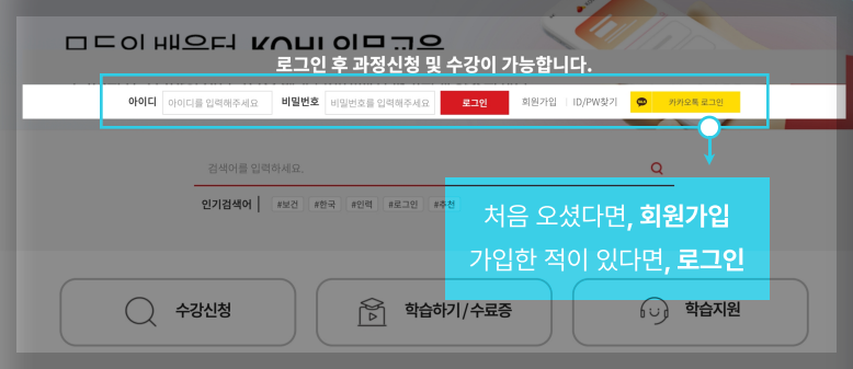 KOHI의무교육을 수강하려면 ①먼저 KOHI의무교육 사이트에 가입하여 로그인해야 합니다. 그 후에 ②원하는 교육과정을 선택하고 수강신청을 완료하면 됩니다.