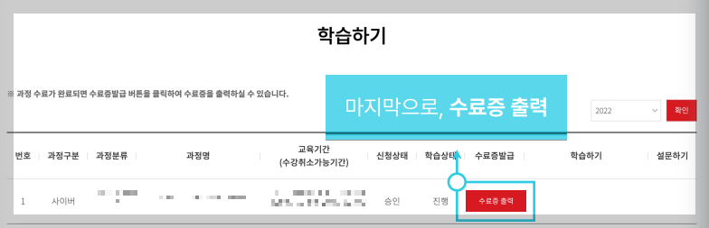 ✔️중앙의 [학습하기 / 수료증] 메뉴 선택 ▶ 수강신청한 과정 우측 [학습하기] 선택